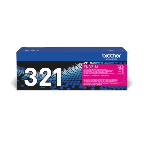 Oryginalny toner Brother TN-321M w kolorze purpurowym (magenta), o standardowej wydajności do 1 400 stron. Kompatybilny z kolorowymi drukarkami i urządzeniami wielofunkcyjnymi Brother.